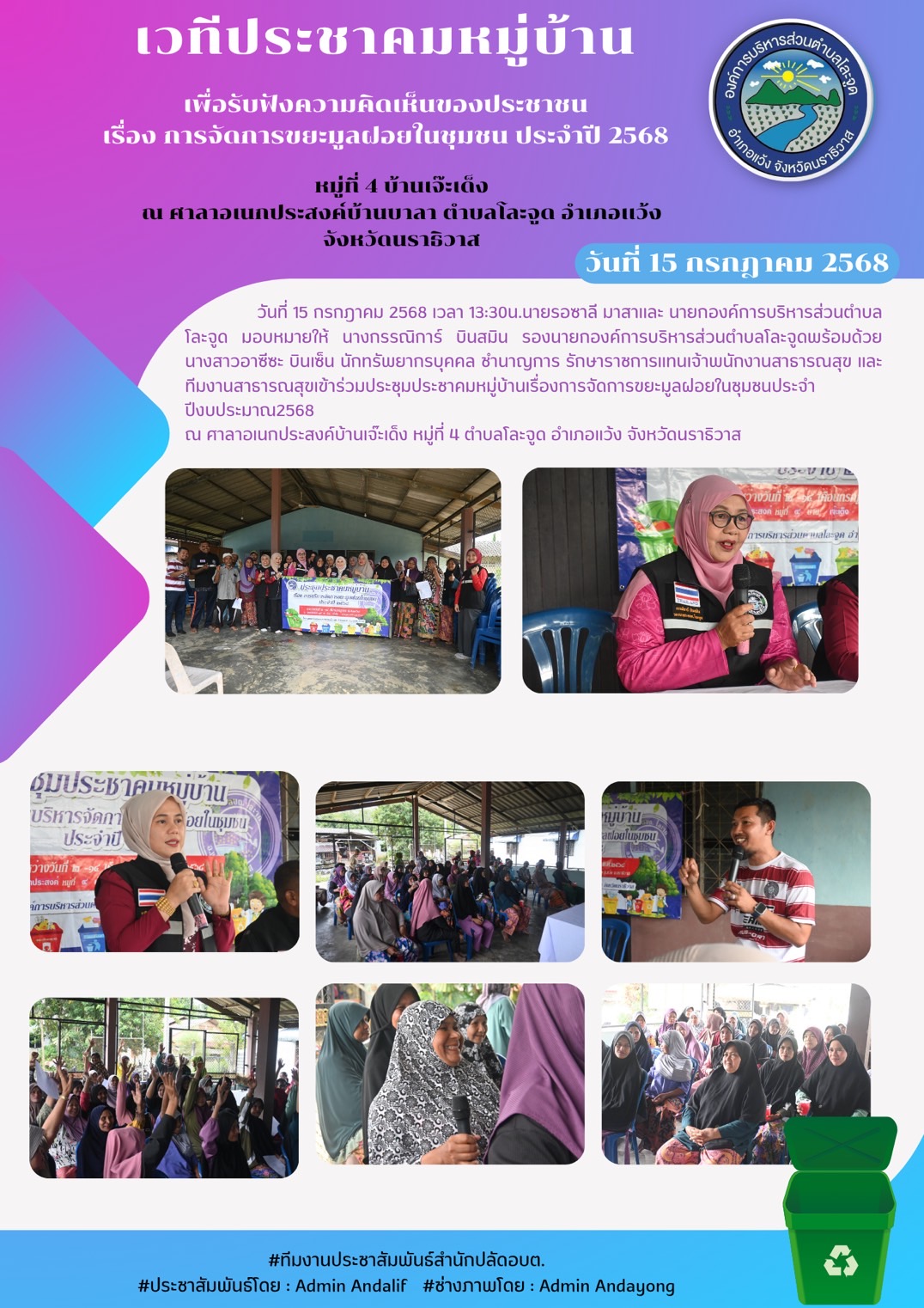 . ขอ อภัย ในความไม่สะดวก ขณะนี้เว็บไซต์องค์การบริหารส่วนตำบลโละจูด อยู่ในช่วงการปรับปรุง....ยินดีต้อนรับเข้าสู่เว็บไซต์องค์การบริหารส่วนตำบลโละจูด หมู่ที่ 2 ถนนสุขาภิบาล 2 ตำบลโละจูด อำเภอแว้ง จังหวัดนราธิวาส 96160 . โทรศัพท์ 073-586140 / 073-586130 :: ด้วยสถานการณ์การแพร่ระบาดของโรคเชื้อไวรัสโคโรนา COVID-19 ที่กำลังแพร่ระบาดอยู่ทั้งในและนอกประเทศในขณะนี้ องค์การบริหารส่วนตำบลโละจูด จึงขอเรียนชี้แจงให้พี่น้องประชาชนตำบลโละจูด ได้ทราบถึงภัยที่กำลังเกิดขึ้นในขณะนี้ โดยให้ปฏิบัติตนตามคำสั่งของทางกระทรวงสาธารณสุข และคำสั่งของจังหวัดนราธิวาส อย่างเคร่งครัด และเพื่อให้ได้รับข้อมูลข่าวสารที่เป็นประโยชน์ องค์การบริหารส่วนตำบลโละจูด จึงขอให้พี่น้องประชาชนตำบลโละจูด ได้ติดตามข่าวสารจากทางหน่วยงานภาครัฐ หากมีข้อสงสัยติดต่อสอบถามได้ที่ ฝ่ายประชาสัมพันธ์ องค์การบริหารส่วนตำบลโละจูด (ในวันและเวลาราชการ) .