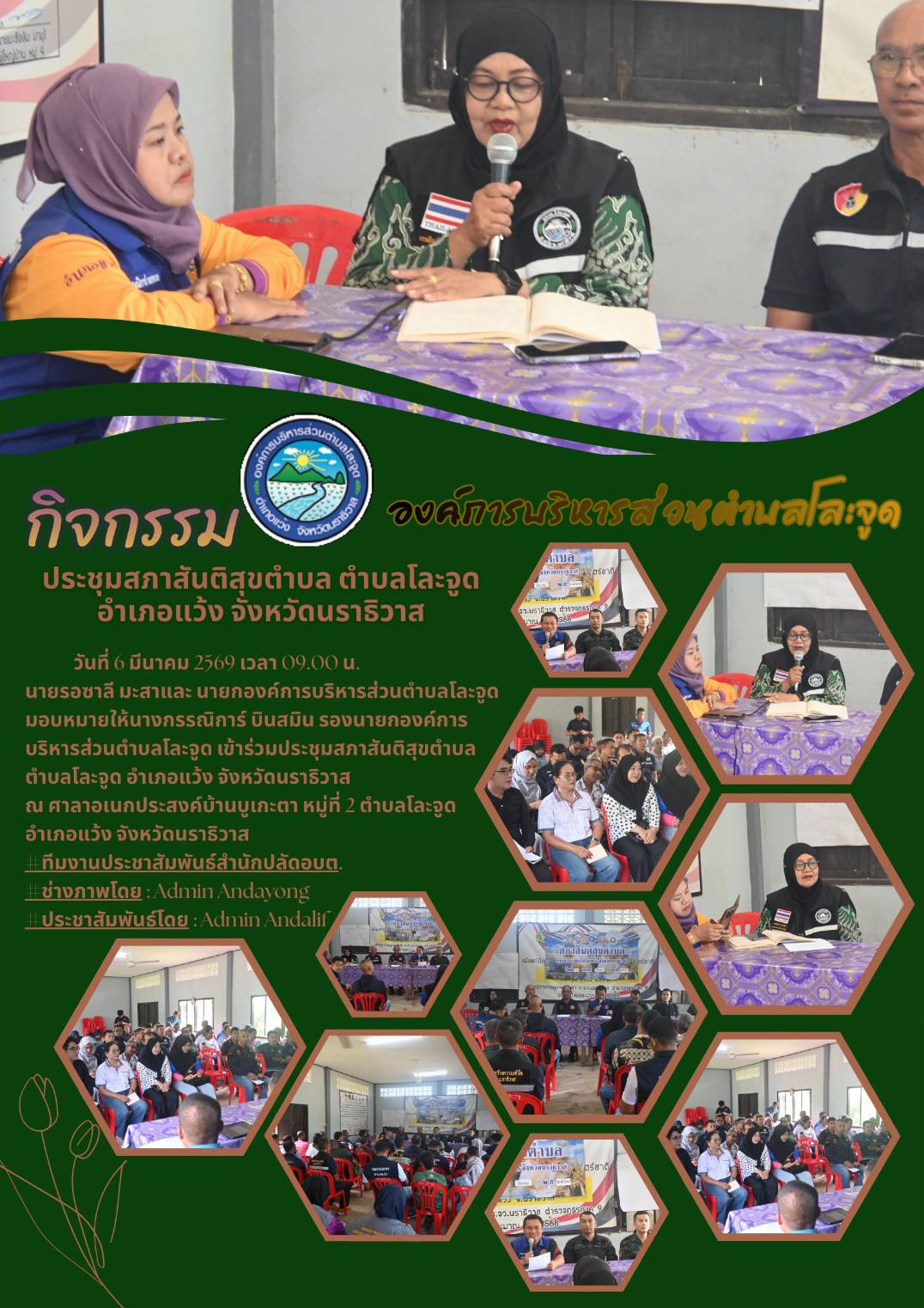 . ขอ อภัย ในความไม่สะดวก ขณะนี้เว็บไซต์องค์การบริหารส่วนตำบลโละจูด อยู่ในช่วงการปรับปรุง....ยินดีต้อนรับเข้าสู่เว็บไซต์องค์การบริหารส่วนตำบลโละจูด หมู่ที่ 2 ถนนสุขาภิบาล 2 ตำบลโละจูด อำเภอแว้ง จังหวัดนราธิวาส 96160 . โทรศัพท์ 073-586140 / 073-586130 :: ด้วยสถานการณ์การแพร่ระบาดของโรคเชื้อไวรัสโคโรนา COVID-19 ที่กำลังแพร่ระบาดอยู่ทั้งในและนอกประเทศในขณะนี้ องค์การบริหารส่วนตำบลโละจูด จึงขอเรียนชี้แจงให้พี่น้องประชาชนตำบลโละจูด ได้ทราบถึงภัยที่กำลังเกิดขึ้นในขณะนี้ โดยให้ปฏิบัติตนตามคำสั่งของทางกระทรวงสาธารณสุข และคำสั่งของจังหวัดนราธิวาส อย่างเคร่งครัด และเพื่อให้ได้รับข้อมูลข่าวสารที่เป็นประโยชน์ องค์การบริหารส่วนตำบลโละจูด จึงขอให้พี่น้องประชาชนตำบลโละจูด ได้ติดตามข่าวสารจากทางหน่วยงานภาครัฐ หากมีข้อสงสัยติดต่อสอบถามได้ที่ ฝ่ายประชาสัมพันธ์ องค์การบริหารส่วนตำบลโละจูด (ในวันและเวลาราชการ) .